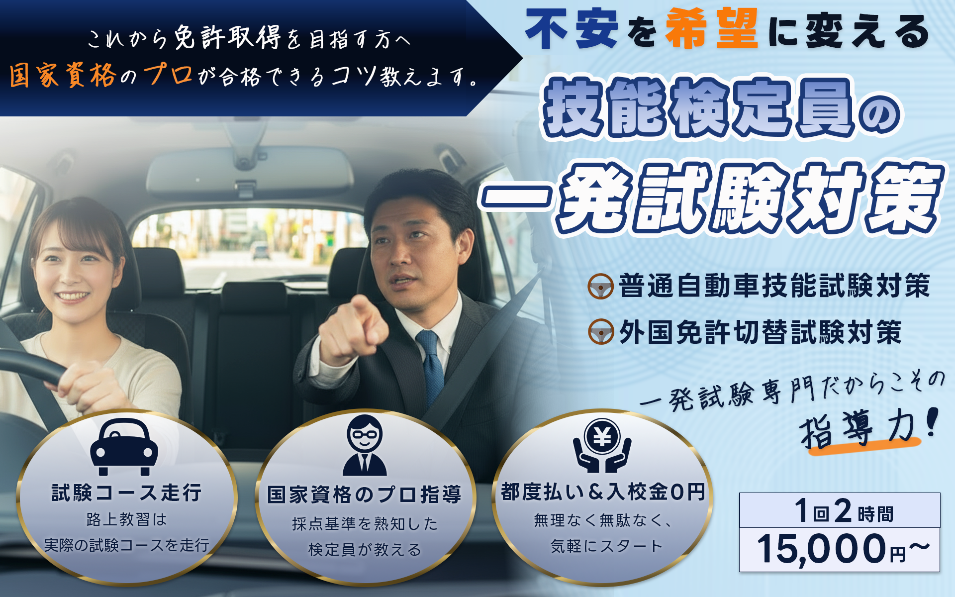 画像(AIにて生成)は、インストラクターが指導している様子にし、インストラクターが中央に来るように配置。信頼感のある男性指導員であることと、路上教習で試験コースを走行出来る事が一目でわかる画像にしました。